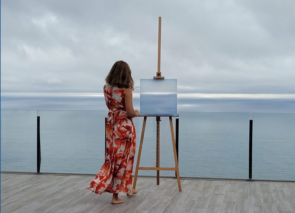 To także moja potrzeba szukania harmonii w spokojnych okolicznościach wakacji, w oddaleniu od codzienności, w zapomnieniu o świecie, gdzie wojna i zaraza, gdzie niepewność i polityczne okładanie maczugą. Uciec w łagodność błękitu. W ikonę oceanu, z jego majestatycznym rytmem. W wodę, która oczyszcza. W każdym płótnie zapieczętowane jest na zawsze ludzkie uczucie, łagodna pieśń duszy, unikalna chwila. Żadnen z nich nie jest do powtórzenia, każdy ma swoją indywidualną pieczęć w kolorze człowieczego natchnienia.